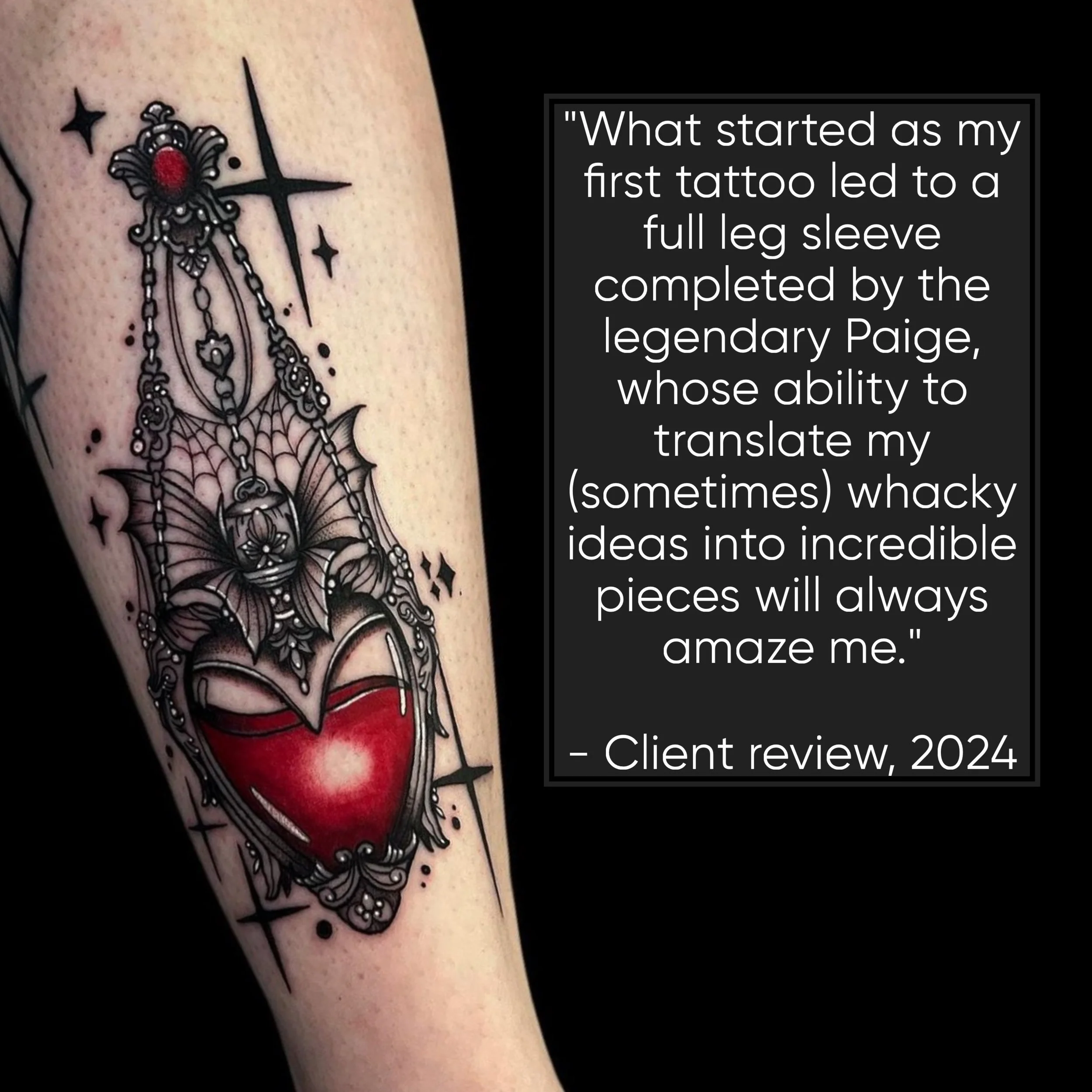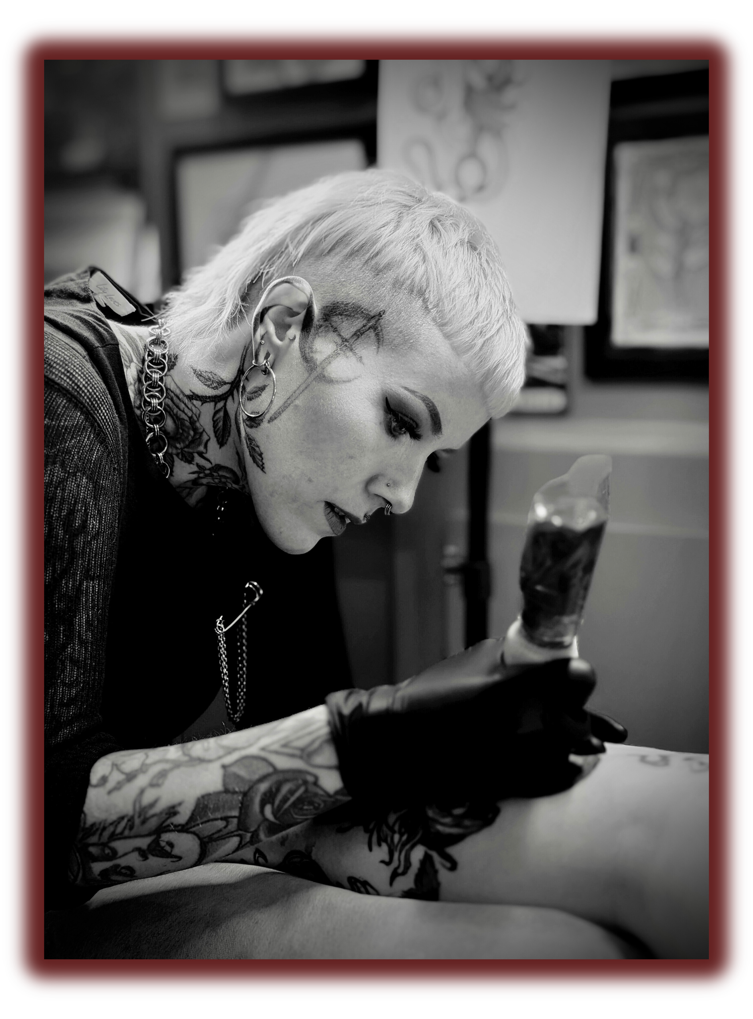 Paige loves working in a multitude of different styles outside of her signature Gothic Blackwork, with a love for anything ornamental, spooky, illustrative and even colour tattoos. Paige also enjoys working with her clients to achieve cover-ups and refreshing tired designs.